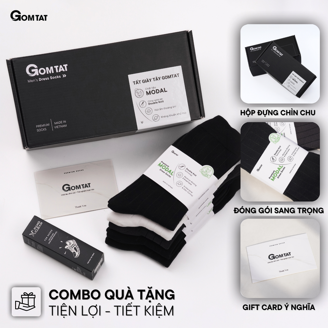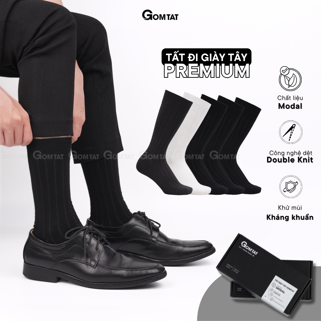 Hộp 5 đôi tất nam đi giày tây GOMTAT chất liệu sợi Modal gỗ sồi cao cấp kháng khuẩn khử mùi - MODAL-STA-5012-CB5: Là loại tất công sở phù hợp cho KH cá tính mạnh phối với giày thể thao, hoặc giày tây công sở, chất liệu sợi MODAL khử mùi thoáng khí, phù hợp với da nhạy cảm, êm ái khi sử dụng. CHI TIẾT SẢN PHẨM - Chất liệu: 95% Sợi Modal + 5% Spandex - Thương Hiệu: Gom Tất - Mã SP: MODAL-STA-5012-CB5 - Đơn vị tính: Hộp 5 Đôi Tất - Phân Loại: + Balance (3 ĐEN + 2 TRẮNG + 1 RÊU ĐEN) + Mono (3 ĐEN + 2 TRẮNG) + Classic (5 ĐÔI ĐEN) + Modern (5 ĐÔI RÊU ĐEN) - Size: Chân Nam từ 38 - 44 (Tất co giãn theo size chân) ĐẶC ĐIỂM NỔI BẬT - Kháng khuẩn khử mùi, mềm mại, thấm hút mồ hôi mang lại cảm giác mát mẻ khô thoáng suốt 4 mùa - Chất liệu sợi MODAL bền Form, an toàn cho da nhạy cảm và kháng khuẩn cực tốt - Sản phẩm mịn mà, không bị xù lông khi dùng - Màu sắc đa dạng sản phẩm dễ dàng phối đồ