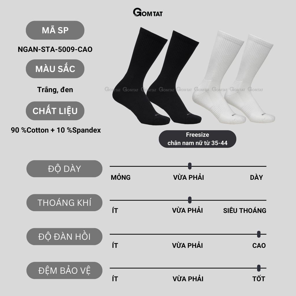 CHI TIẾT SẢN PHẨM - Thương Hiệu: Gom Tất - Tự Hào Thương Hiệu Việt - Chất liệu: 90% Sợi Cotton + 10% Spandex - Mã SP: NGAN-STA-5009-CAO-CB10 - Màu sắc: Đen, Trắng (quý khách hàng vui lòng chọn màu khi đặt hàng) - Quy cách đóng gói: Số lượng 1 là 10 đôi, màu như hình ảnh mô tả - Size: Chân Nam Nữ size từ 35 đến 44 (Tất co giãn theo size chân)