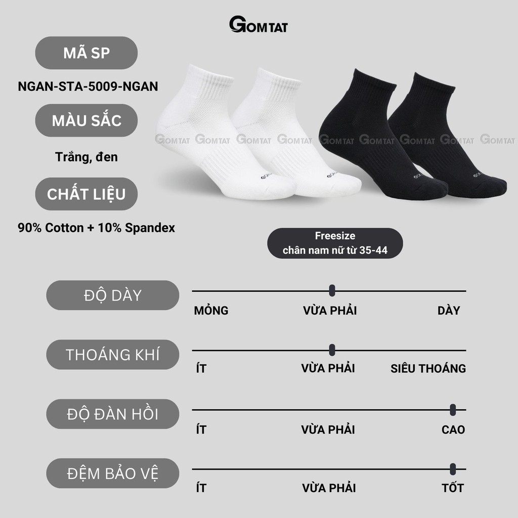 CHI TIẾT SẢN PHẨM - Thương Hiệu: Gom Tất - Tự Hào Thương Hiệu Việt - Chất liệu: 90% Sợi Cotton + 10% Spandex - Mã SP: NGAN-STA-5009-NGAN-CB10 - Màu sắc: Đen, Trắng (quý khách hàng vui lòng chọn màu khi đặt hàng) - Quy cách đóng gói: Số lượng 1 là 10 đôi, màu như hình ảnh mô tả - Size: Chân Nam Nữ size từ 35 đến 44 (Tất co giãn theo size chân)