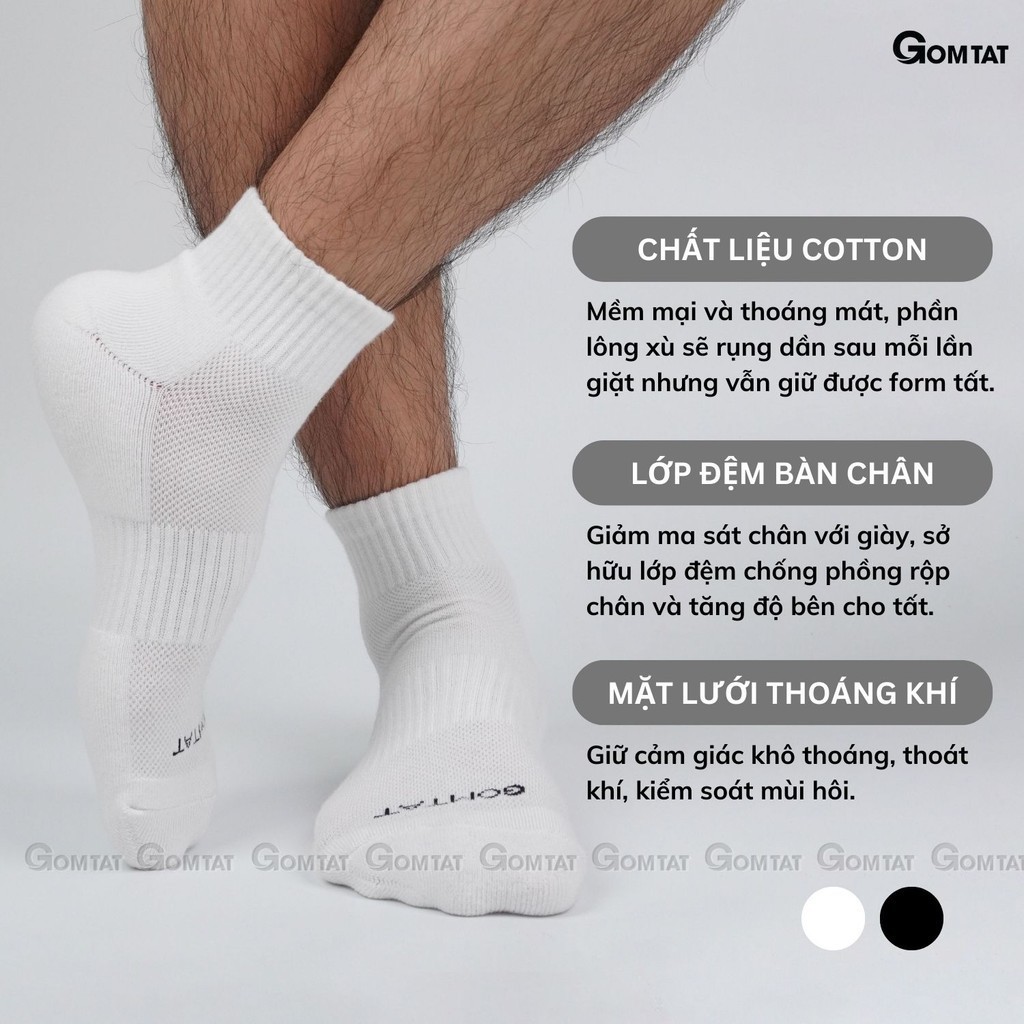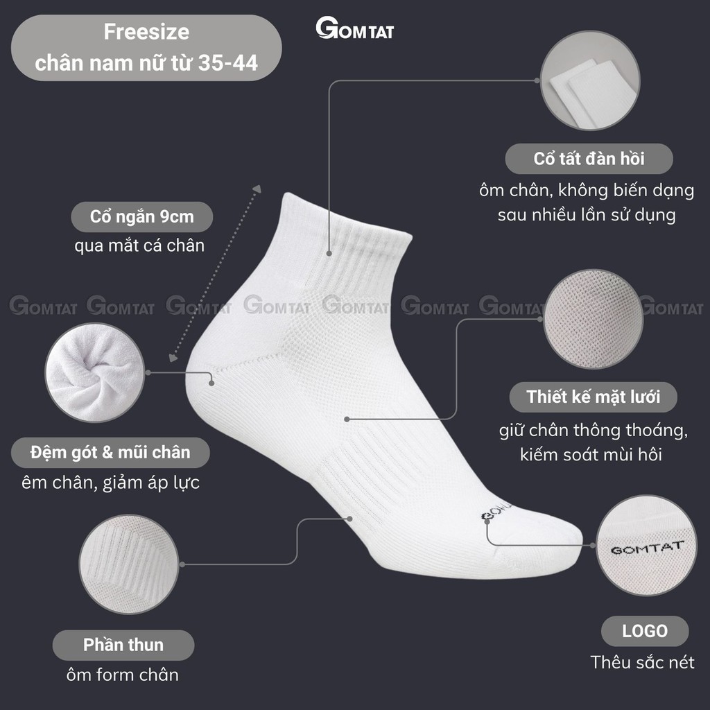 Combo 10 đôi vớ cổ thấp nam nữ GOMTAT, chất liệu cotton hút ẩm khử mùi, có đệm xù êm chân - STA-5009-NGAN-CB10: Là loại tất cổ ngắn với tone màu đơn giản và trẻ trung, rất dễ để phối với giày sneaker, giày thể thao, hoặc giày tây công sở. Tất được làm từ chất liệu cotton có lớp lót xù mềm mại, khả năng hút ẩm và khử mùi tốt, thiết kế mặt lưới thoáng khí mang lại cảm giác thoải mái và dễ chịu cho đôi chân khi sử dụng.