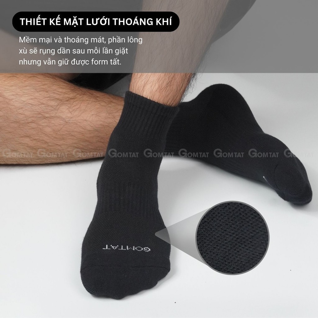 Combo 10 đôi vớ nam nữ màu đen GOMTAT, chất liệu cotton cao cấp, thoáng mát, có lớp xù êm chân - STA-5009-CB10: Là loại tất với tone màu đơn giản và trẻ trung, rất dễ để phối với giày sneaker, giày thể thao, hoặc giày tây công sở. Tất được làm từ chất liệu cotton có lớp lót xù mềm mại, khả năng hút ẩm và khử mùi tốt, thiết kế mặt lưới thoáng khí mang lại cảm giác thoải mái và dễ chịu cho đôi chân khi sử dụng.