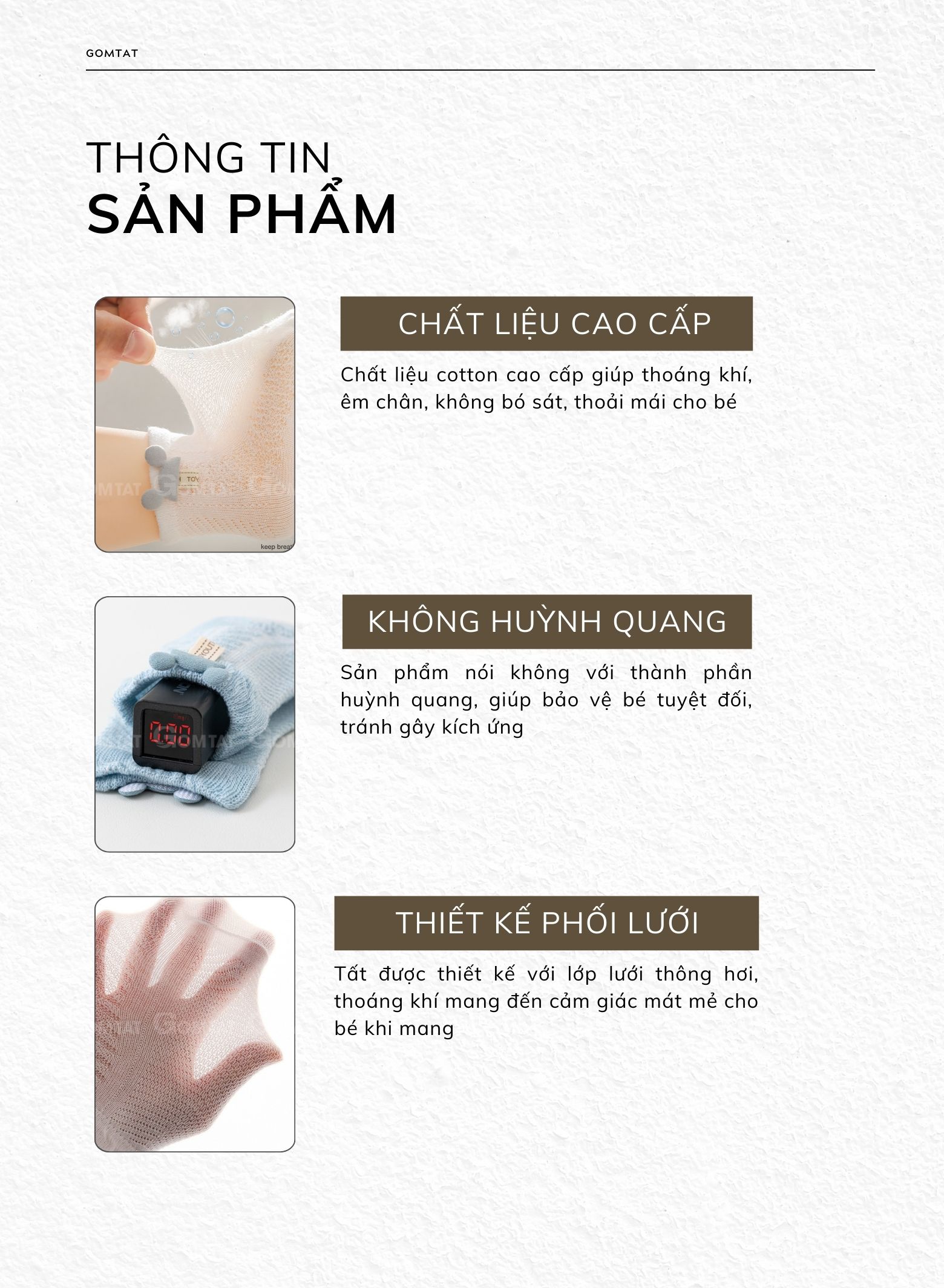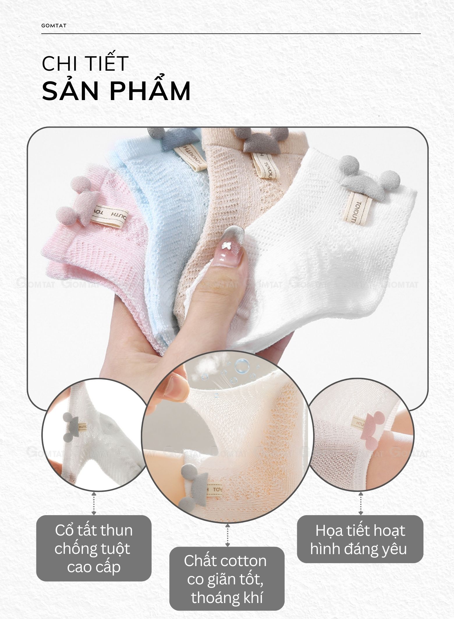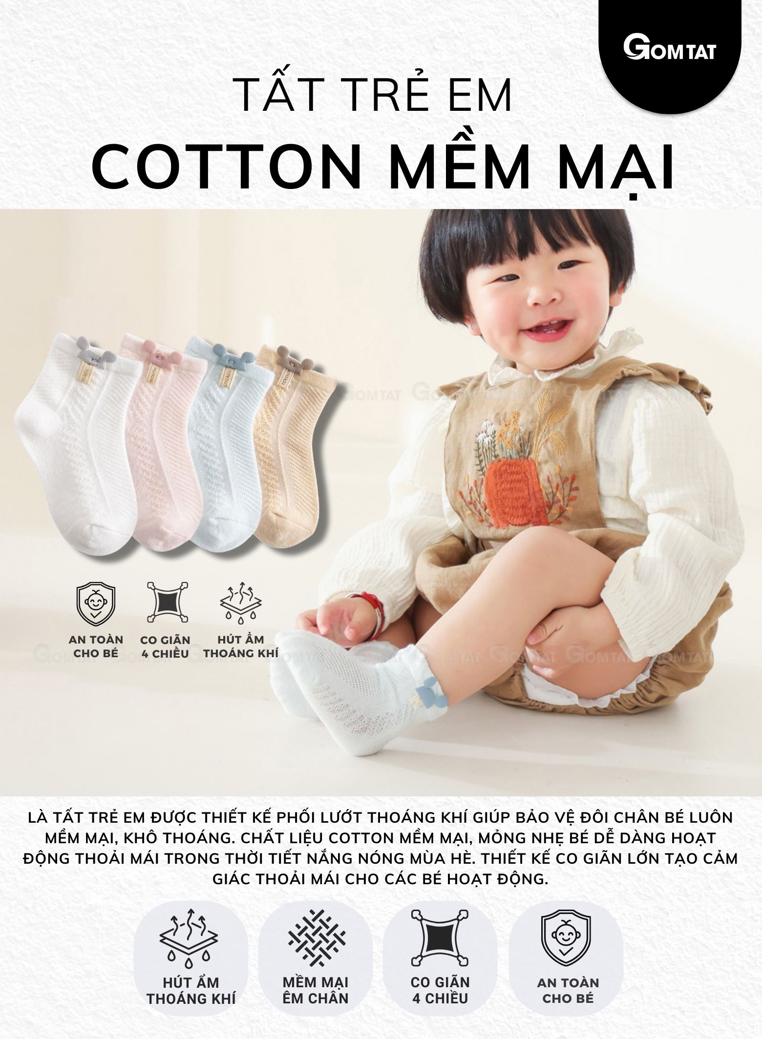 - Vải cotton cao cấp, tất mang lại cảm giác êm ái và dễ chịu cho làn da nhạy cảm của bé, đồng thời thoáng khí để giữ chân bé luôn khô thoáng.