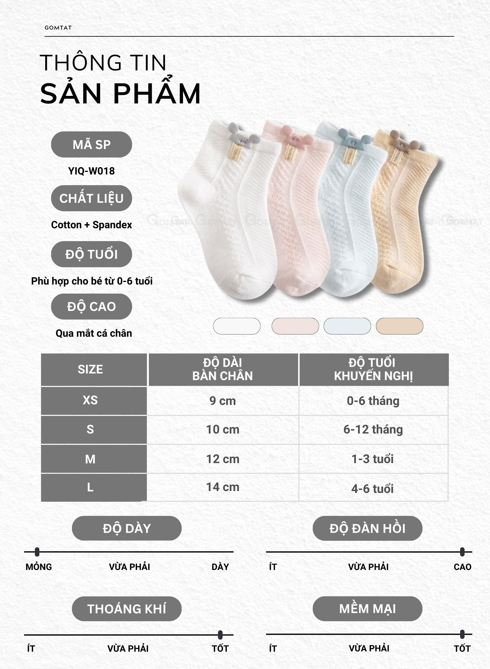 CHI TIẾT SẢN PHẨM - Chất liệu: Cotton + Spandex - Mã SP: YIQ-W018-CB4 - Quy cách đóng gói: 4 đôi đủ màu - Size: XS (0-6 tháng), S (6-12 tháng) M (1-3 tuổi), L (4-6 tuổi) - Màu sắc: Trắng, Hồng, Kaki, Xanh