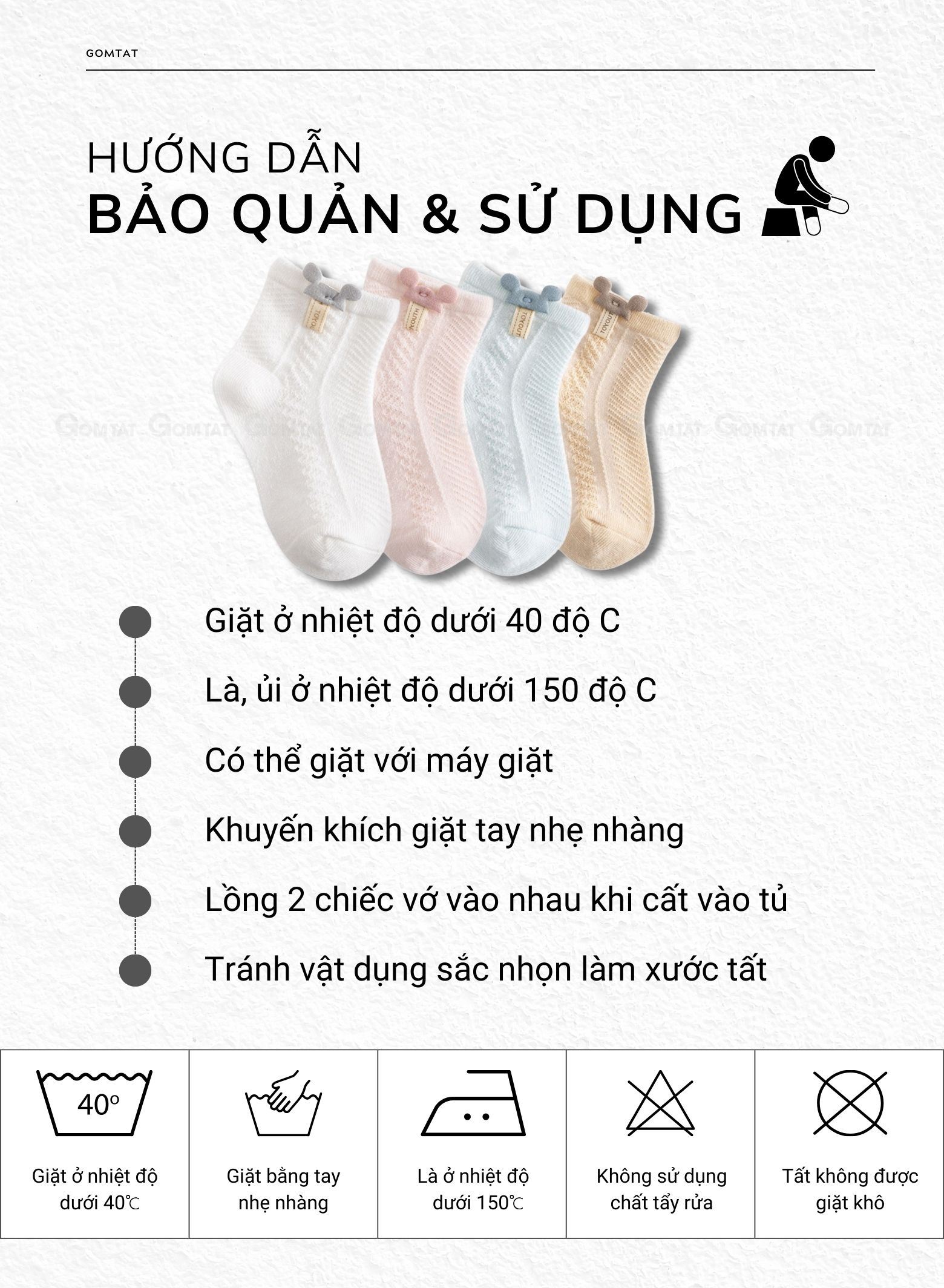 BẢO QUẢN TẤT NHƯ THẾ NÀO? 1. Lộn Tất từ bên trong ra ngoài trước khi giặt. 2. Sắp xếp Tất và giặt theo cặp để tránh bị mất. 3. Giặt bằng máy (đối với hầu hết các loại Tất) và bỏ vào túi giặt. 4. Giặt bằng nước không quá 30 độ C. 5. Không sử dụng thuốc tẩy. 6. Không là/ủi Tất. 7. Sấy khô Tất ở nhiệt độ thấp (chấp nhận được) hoặc để khô tự nhiên.