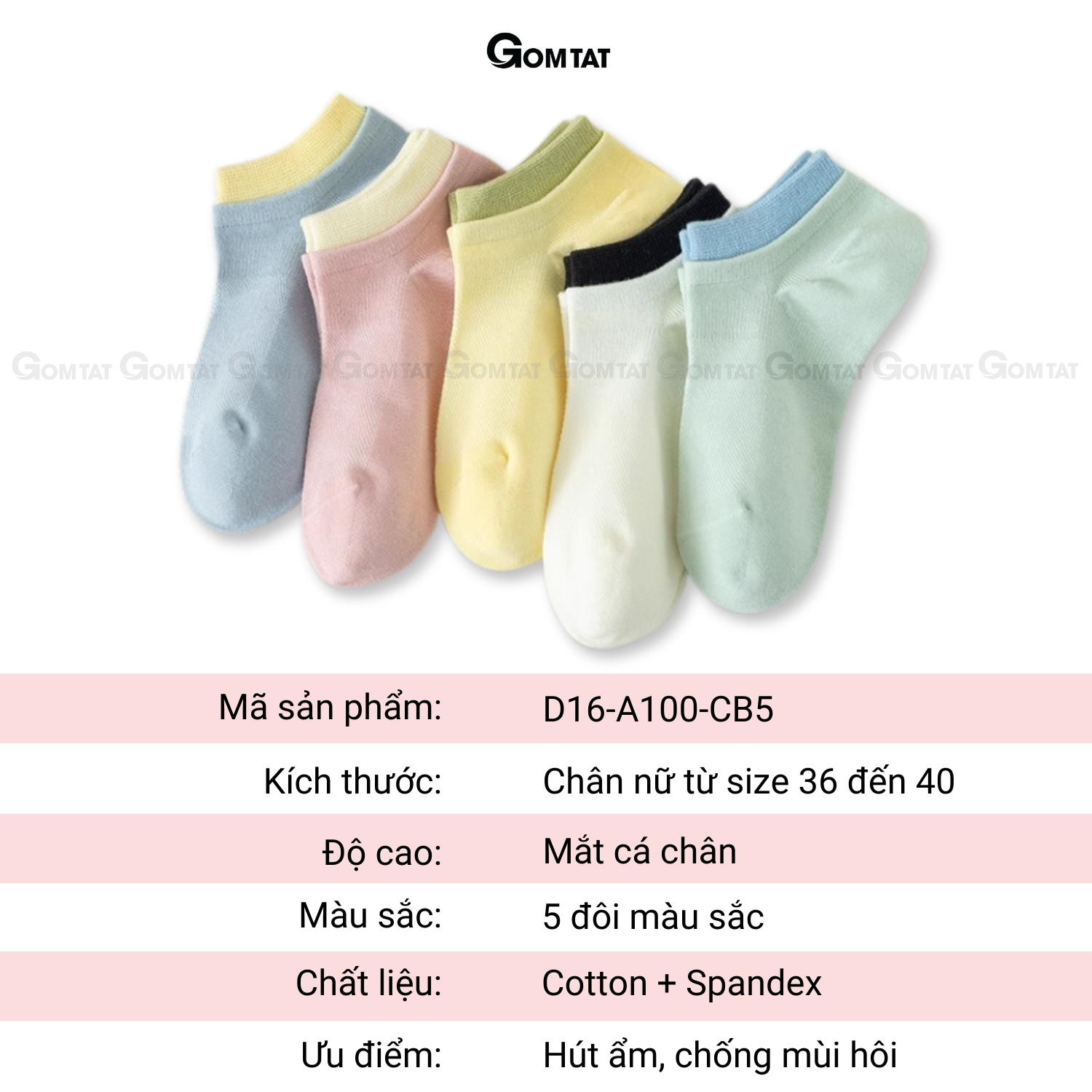 Combo 5 đôi tất chân nữ cổ ngắn chất liệu cotton cao cấp, vớ màu cho nữ mềm mại, êm chân hút ẩm thoáng khí - D16-A100: là loại Vớ cổ ngắn dành cho nữ nhiều màu cá tính, họa tiết trơn tinh tế, chất liệu cotton mềm mại hút ẩm thoáng khí khử mùi hiệu quả. *Shop xin phép đóng gói bằng túi nilon CHI TIẾT SẢN PHẨM - Chất liệu: Sợi cotton + spandex - Quy cách đóng gói: 5 đôi, màu sắc như hình ảnh mô tả - Size: Chân Nữ từ 36 - 40 (Tất co giãn theo size chân) ĐẶC ĐIỂM NỔI BẬT - Che khuyết điểm chân cực tốt - Có thiết kế sợi cotton cao cấp hút ẩm thoáng khí êm chân - Màu sắc xanh tươi mát dễ dàng phối đồ VÌ SAO BẠN CHỌN CHÚNG TÔI - Cam kết 100% đúng hình ảnh, thông tin mô tả - Đổi trả miễn phí, theo chính sách trả hàng hoàn tiền từ sàn HƯỚNG DẪN GIẶT - Giặt ở nhiệt độ dưới 40 độ C - Là, ủi ở nhiệt độ dưới 150 độ C - Có thể giặt với máy giặt (Khuyên dùng với túi giặt máy) - Tất có thể giặt bằng máy giặt nhưng GOM khuyến khích bạn giặt tay nhẹ nhàng để giữ được độ bền của tất. - Lồng 2 chiếc vớ vào nhau khi cất vào tủ để tránh thất lạc tất. - Tránh những vật dụng sắc nhọn làm xước tất.