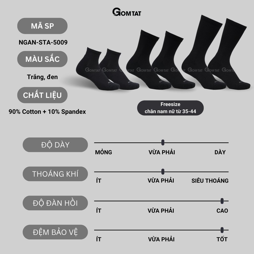 CHI TIẾT SẢN PHẨM - Thương Hiệu: Gom Tất - Tự Hào Thương Hiệu Việt - Chất liệu: 90% Sợi Cotton + 10% Spandex - Mã SP: NGAN-STA-5009-CB5 - Màu sắc: Đen, Trắng (quý khách hàng vui lòng chọn màu khi đặt hàng) - Quy cách đóng gói: Số lượng 1 là 5 đôi, màu như hình ảnh mô tả - Size: Chân Nam Nữ size từ 35 đến 44 (Tất co giãn theo size chân)