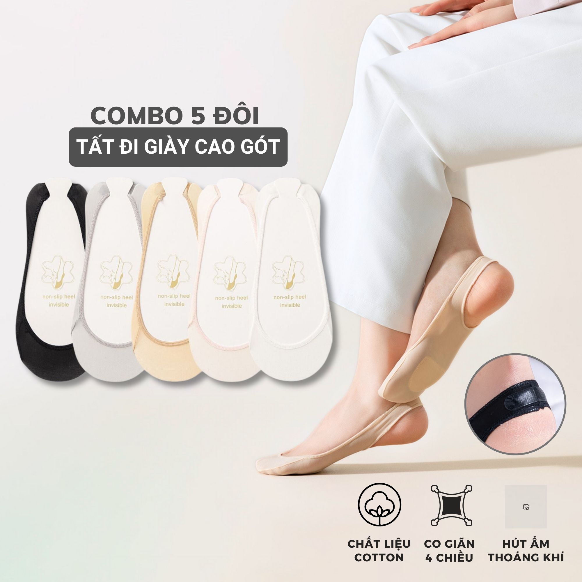 Combo 5 đôi tất đi giày cao gót nữ GOMTAT có đệm cao su chống tuột gót, có miếng đệm dưới bàn chân- CAOGOT-SUX-19218-CB5: loại tất vớ nữ được thiết kế chuyên dùng để đi giày cao gót, có miếng đệm mềm mại giảm mạnh tình trạng đau chân khi sử dụng giày cao gót trong thời gian dài