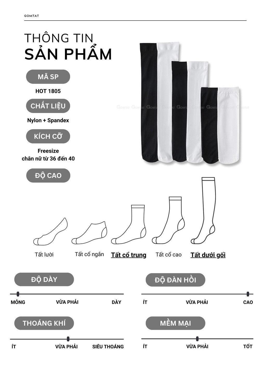 CHI TIẾT SẢN PHẨM - Chất liệu: Sợi Nylon + Spandex - Mã SP: HOT-1805-CB5 - Quy cách đóng gói: số lượng 1 là 5 đôi - Màu sắc: Trắng, Đen - Chiều dài: Dưới bắp chân, Gần gối, Qua gối - Size: Chân Nữ từ 36 đến 40 (Tất co giãn theo size chân)