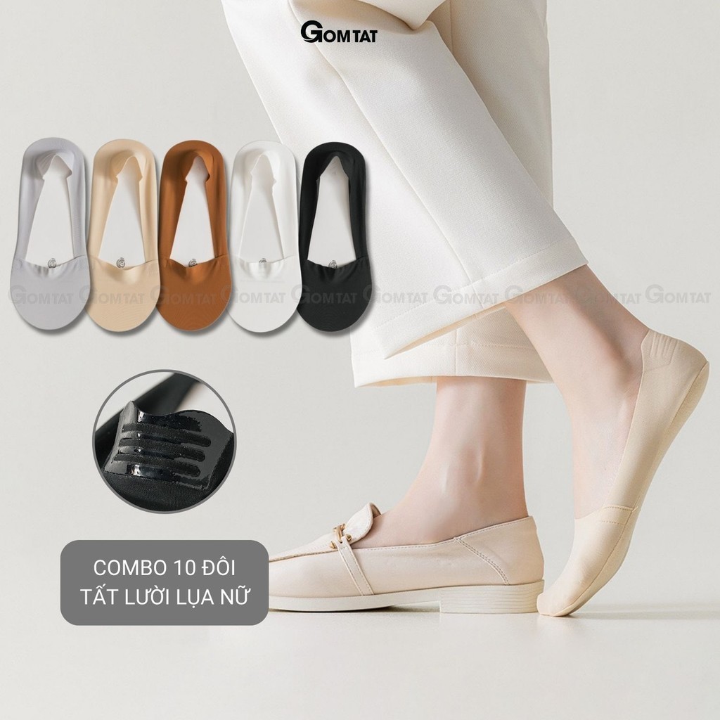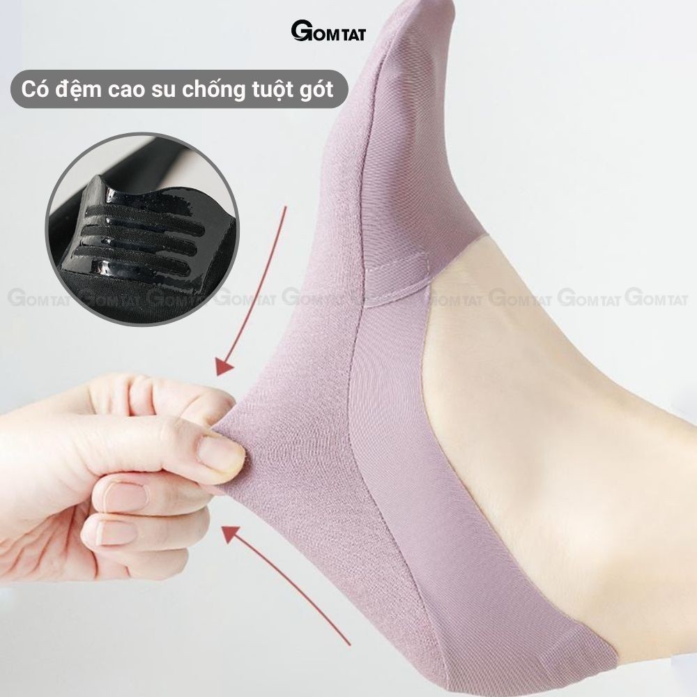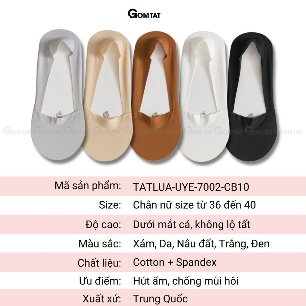 Combo 5 đôi tất lười nữ đi giày búp bê GOMTAT, chất liệu lụa cotton mềm mát, thấm hút thoáng khí - TATLUA-UYE-7002-CB10: loại vớ siêu ngắn thích hợp cho các bạn thích thể loại mang giấu vớ như khi mang giày lười, giày búp bê, hài, giày mọi....ưu điểm là có đệm cao su chống trượt gót chân khi mang.