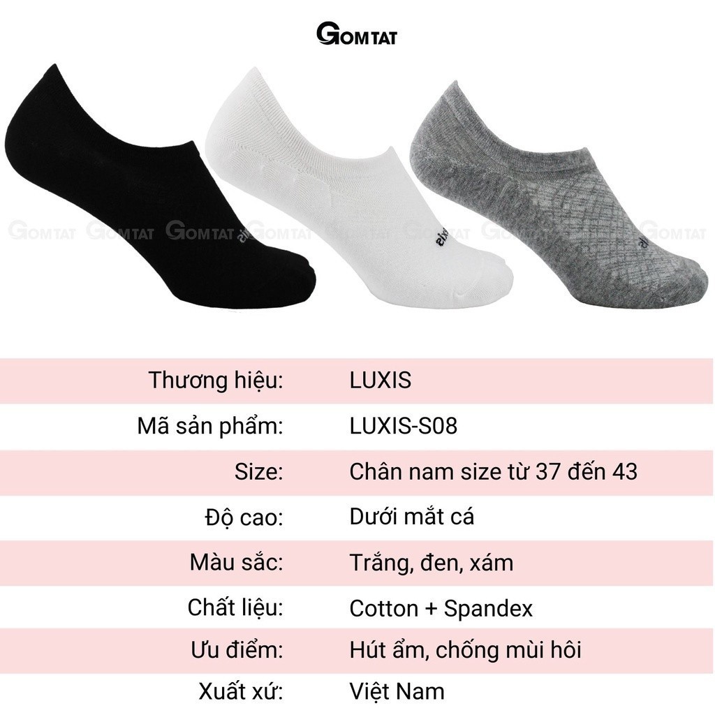 CHI TIẾT SẢN PHẨM - Chất liệu: Sợi Cotton + Spandex - Thương Hiệu: LUXIS - phân phối bởi GOMTAT - Mã SP: LUXIS-S08 - Đơn vị tính: chọn số lượng 1 là 5 đôi - Màu sắc: Trắng, Đen, Xám - Size: Chân Nam từ 38 - 44 (Tất co giãn theo size chân)