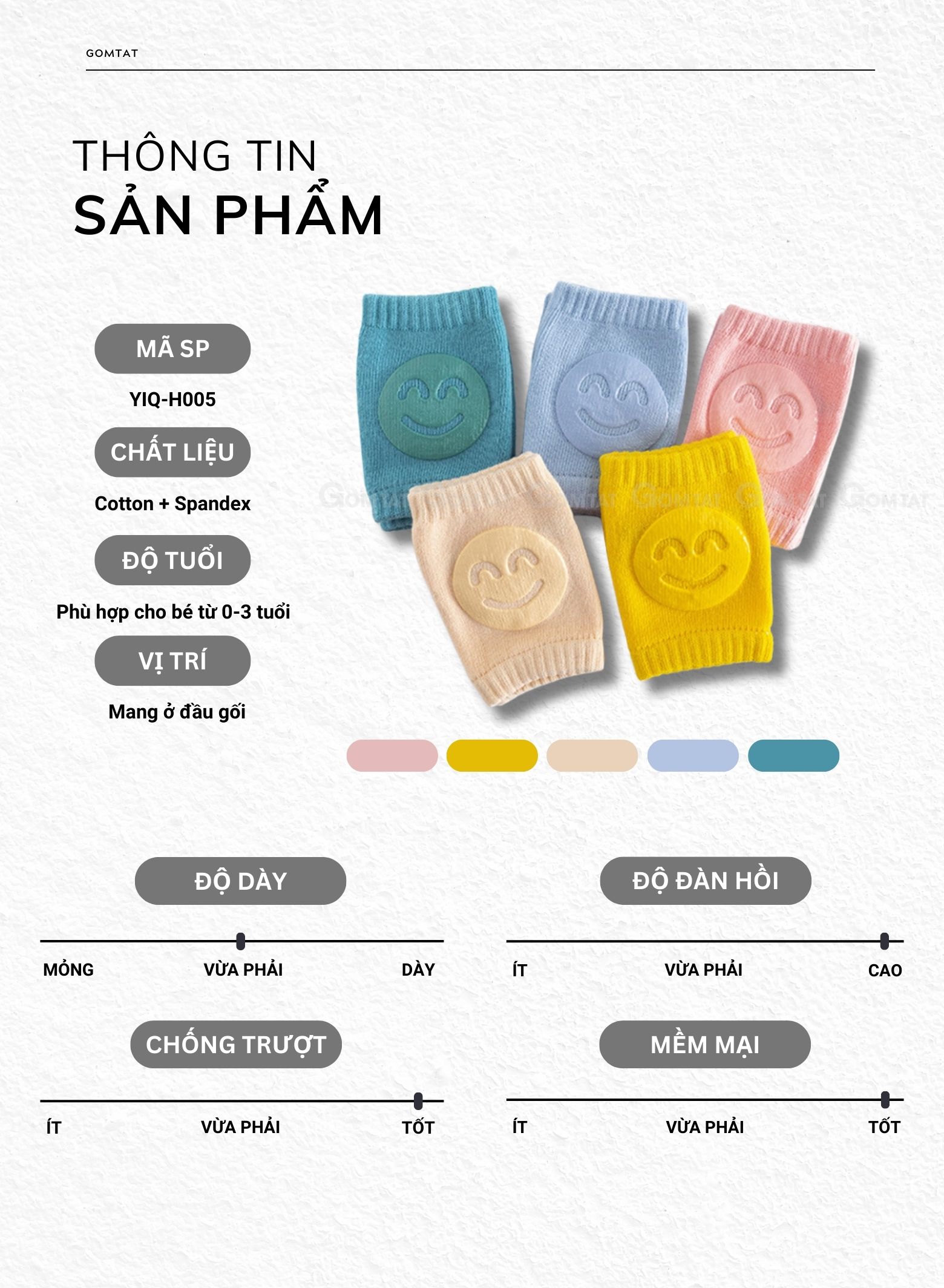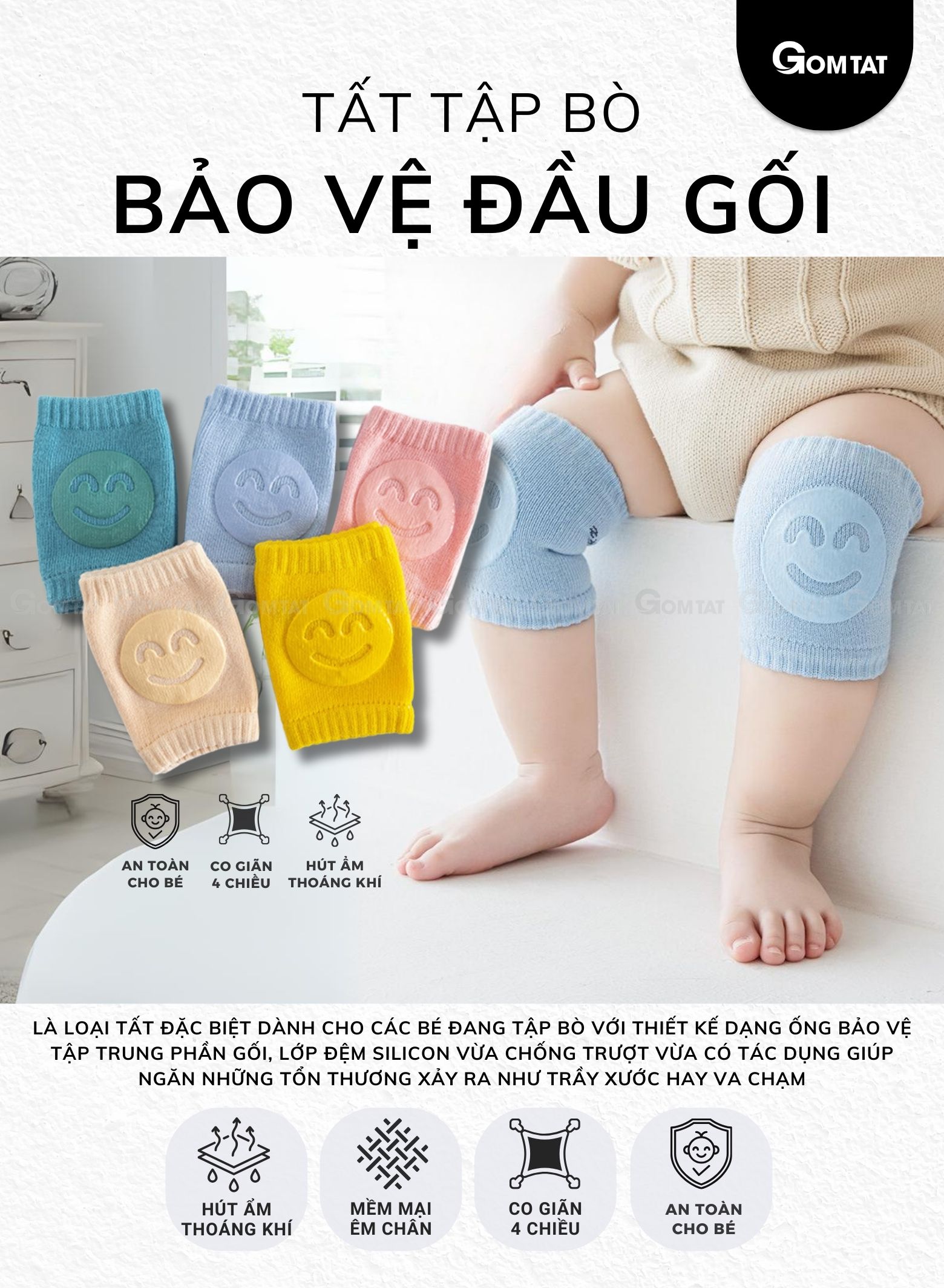 Combo 5 đôi tất tập bò trẻ em GOMTAT vớ bảo vệ gối có đệm silicon cho trẻ dưới 3 tuổi - YIQ-H005-CB5: là loại tất tập bò được thiết kế đặc biệt với đế chống trượt giúp bé an toàn trong những bước đi đầu tiên. Chất liệu cotton mềm mại, thoáng khí, mang lại cảm giác thoải mái cho đôi chân non nớt. Với kiểu dáng dễ thương và đàn hồi tốt, tất ôm vừa vặn chân bé, giữ ấm mà vẫn thoải mái khi vận động. Đây là lựa chọn lý tưởng cho các mẹ để bảo vệ đôi chân của bé yêu trong giai đoạn tập bò và tập đi.
