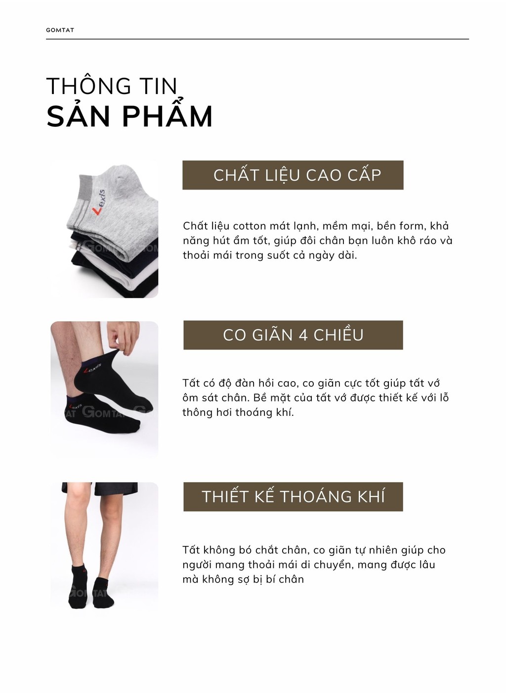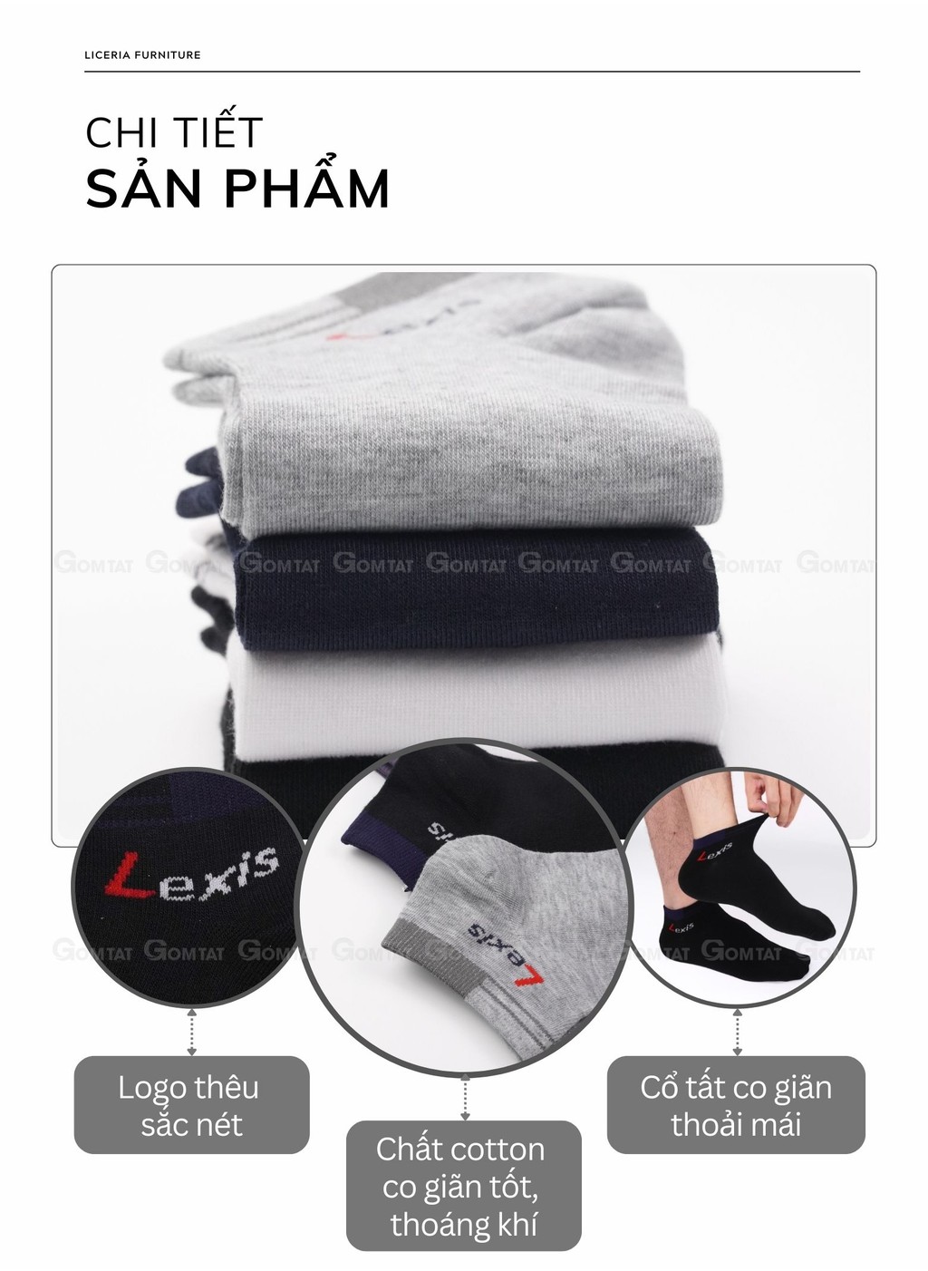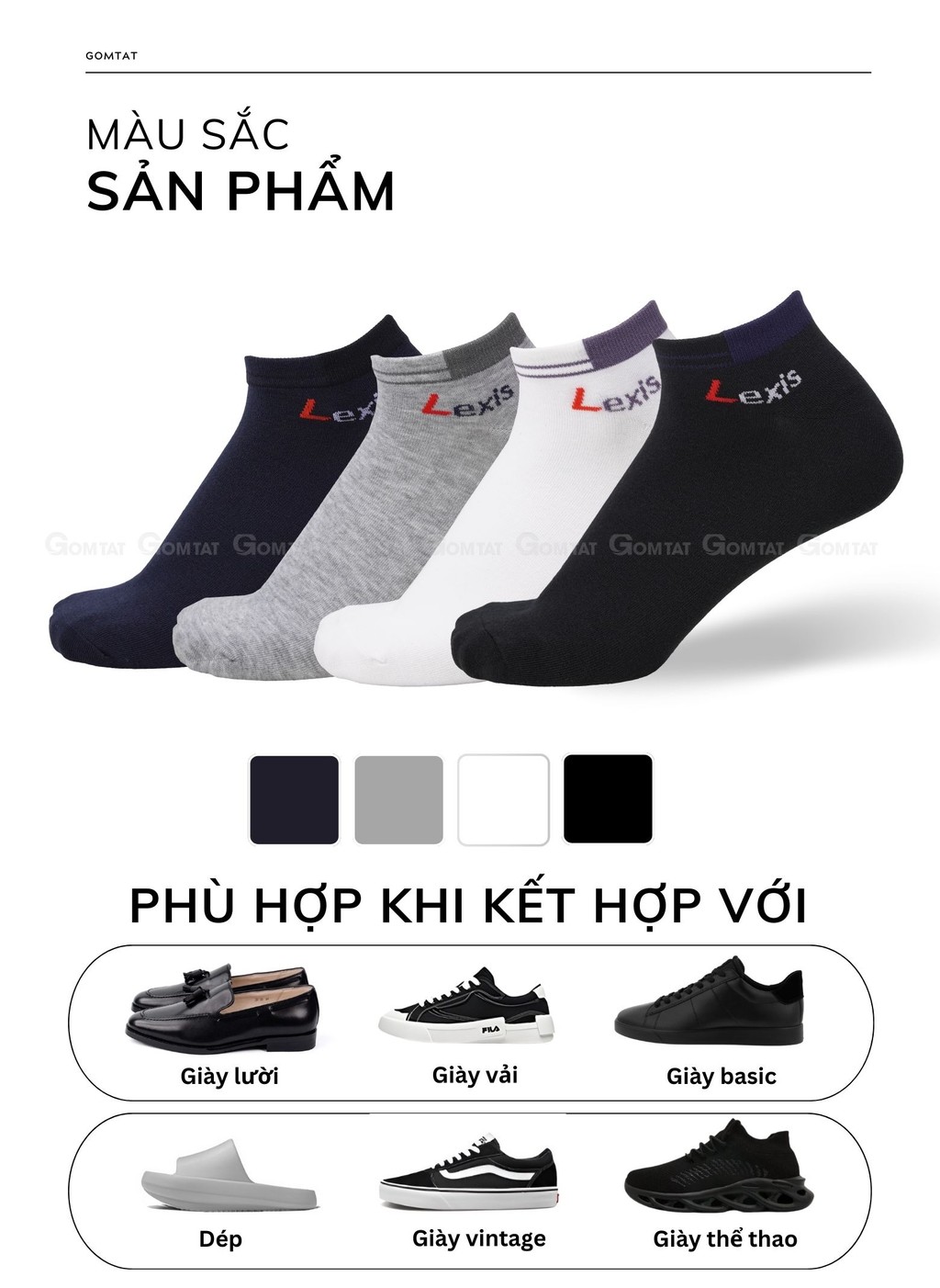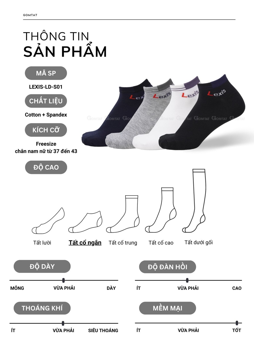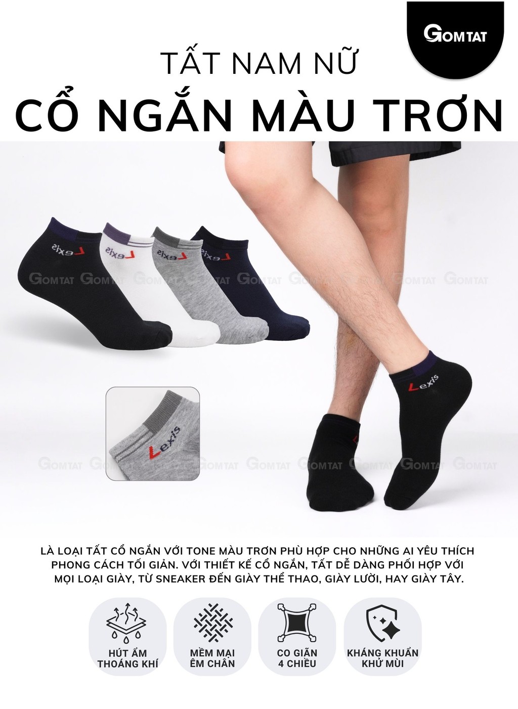 Combo 5 đôi vớ thể thao cổ ngắn nam nữ GOMTAT, tất trơn cổ ngắn vải cotton thoáng mát, không xù lông - LD-S01-LEXIS-CB5