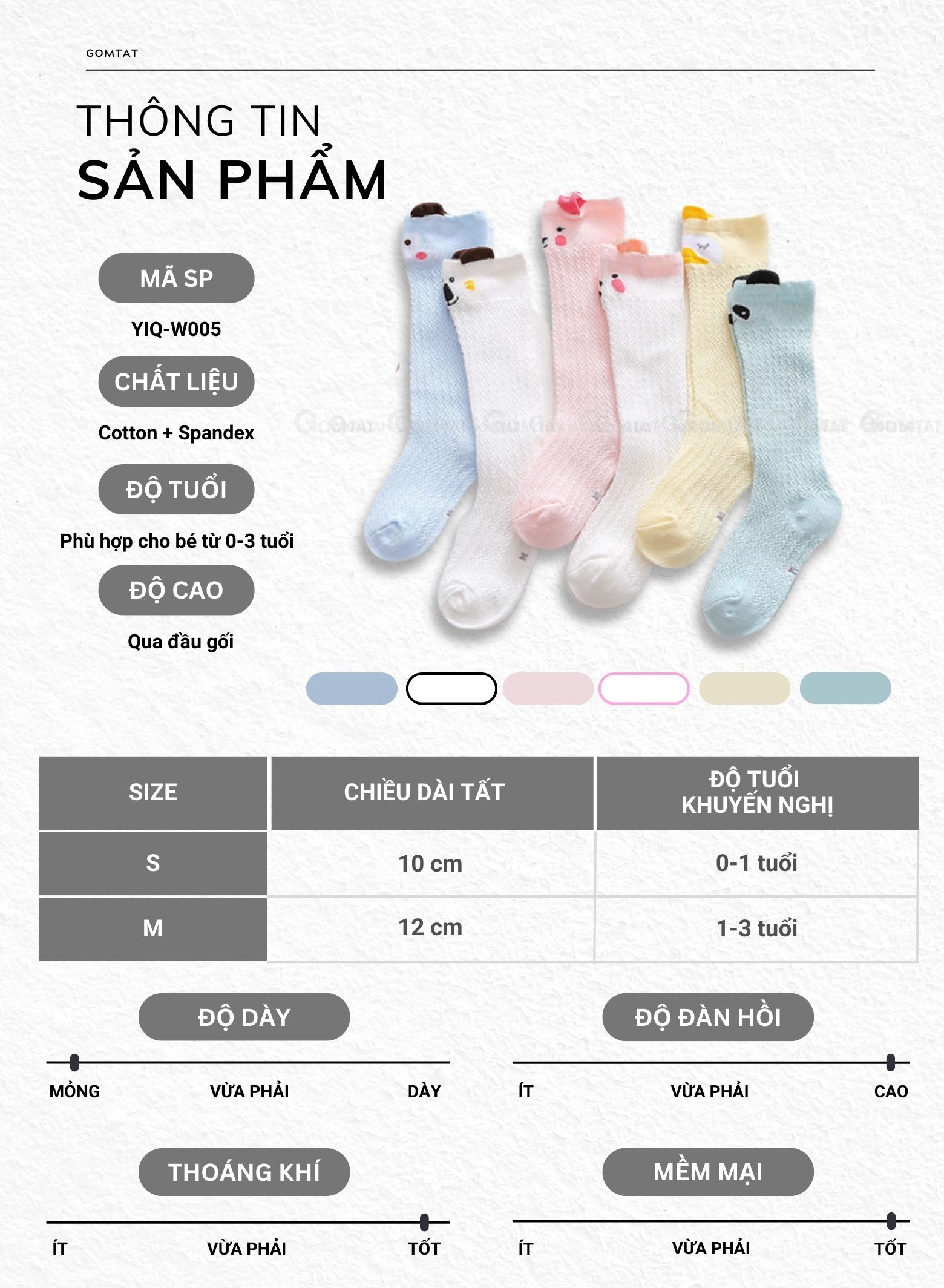 Tất cổ cao hoạ tiết hình thú dễ thương GOMTAT cho bé trai bé gái, vớ cổ cao co dãn nhiều màu sắc dành cho bé - YIQ-W005-1DOI: là loại tất trẻ em được thiết kế với bề mặt lướt thoáng khí giúp bảo vệ đôi chân bé luôn mềm mại, khô thoáng. Chất liệu cotton mềm mại, mỏng nhẹ bé dễ dàng hoạt động thoải mái trong thời tiết nắng nóng mùa hè. Với thiết kế dễ thương và tiện dụng, tất là người bạn đồng hành hoàn hảo cho bé trong những bước đi đầu đời.