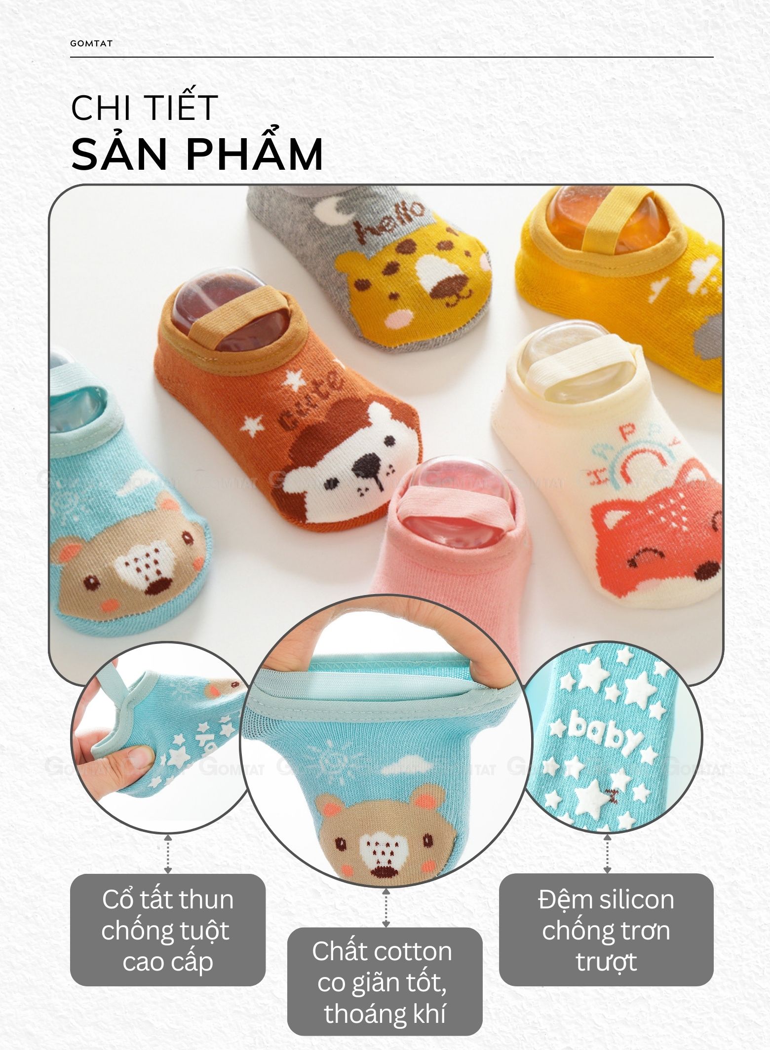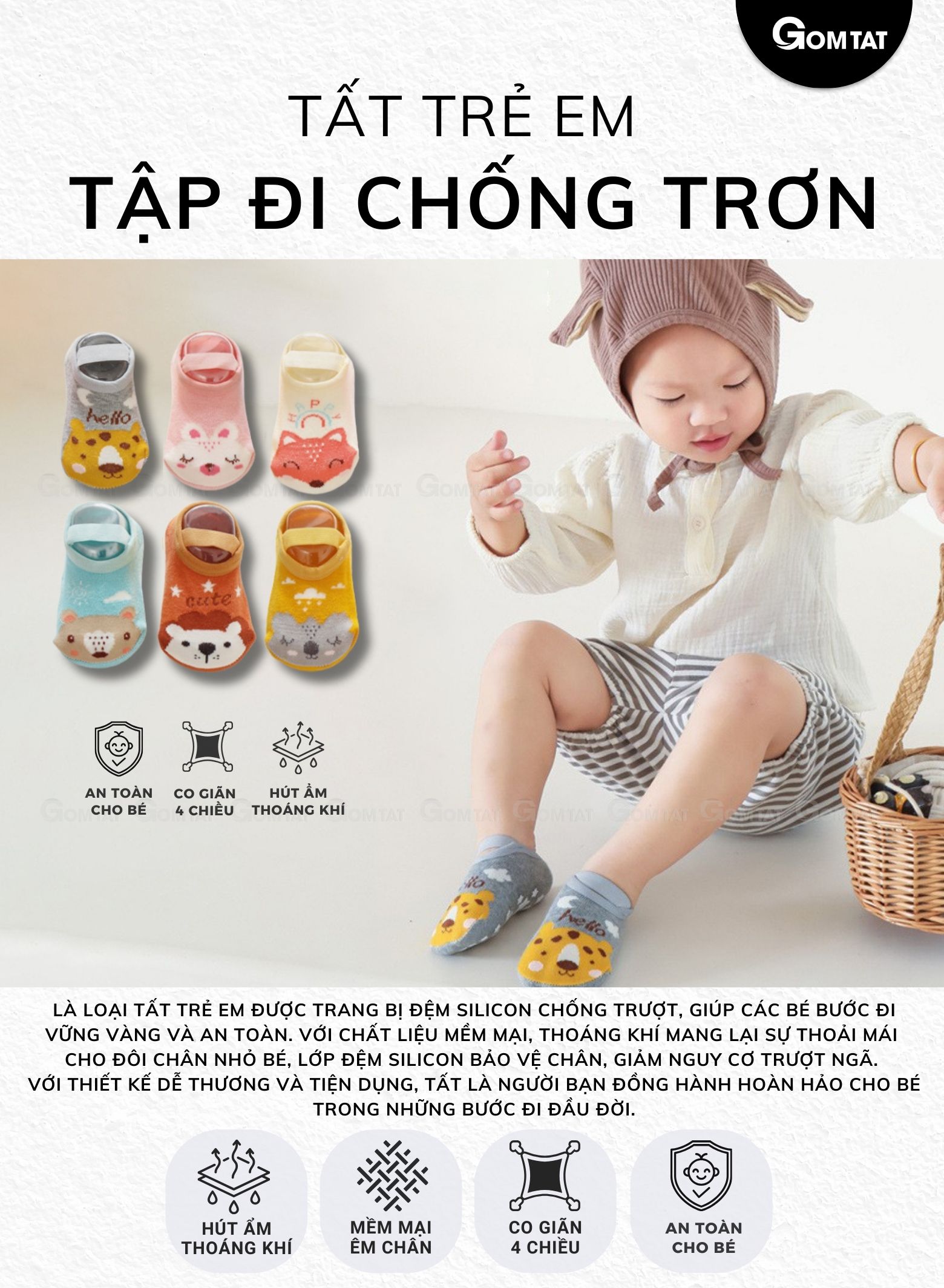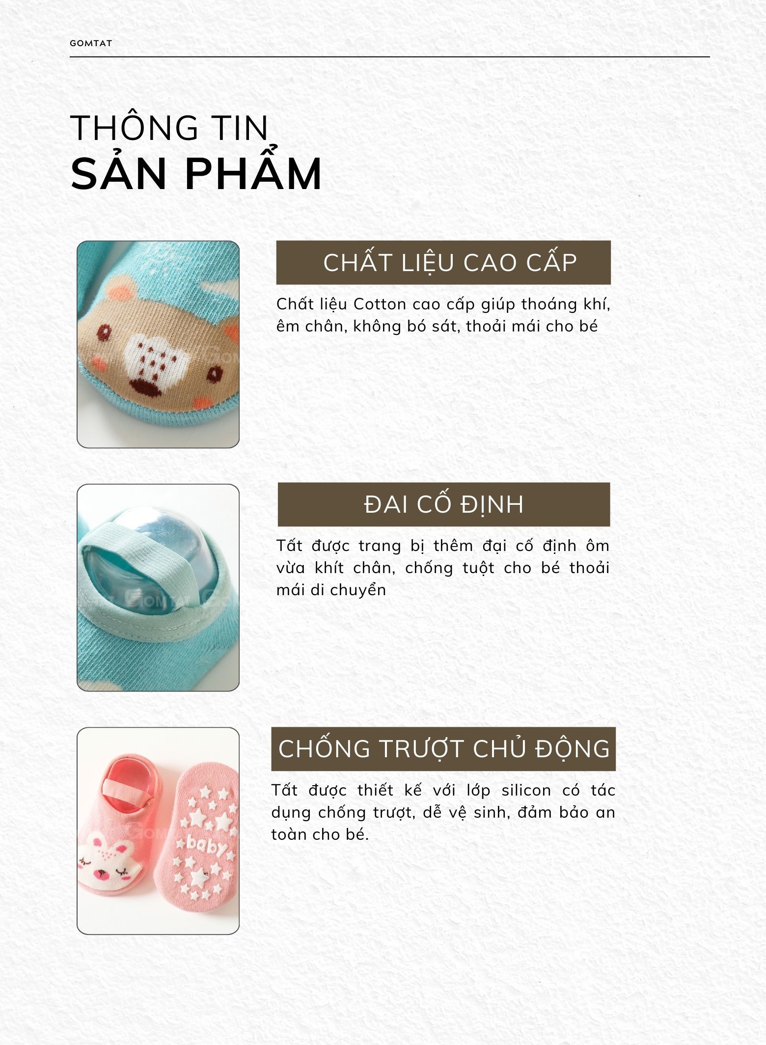 ĐẶC ĐIỂM NỔI BẬT - Tất được trang bị đệm silicon đặc biệt trên lòng bàn chân, giúp giảm ma sát và ngăn ngừa trượt ngã khi bé đi lại. - Sử dụng vải cotton cao cấp, tất mang lại cảm giác êm ái và dễ chịu cho làn da nhạy cảm của bé, đồng thời thoáng khí để giữ chân bé không bí bách. - Đệm silicon không chỉ giảm nguy cơ trượt ngã mà còn bảo vệ bàn chân của bé khỏi va đập và trầy xước. - Tất có độ co giãn cao, ôm vừa vặn chân bé mà không gây chật hay khó chịu, cho phép bé thoải mái vận động. - Đai cố định giúp tất không bị xê dịch hay rơi ra khỏi chân bé suốt thời gian mang.
