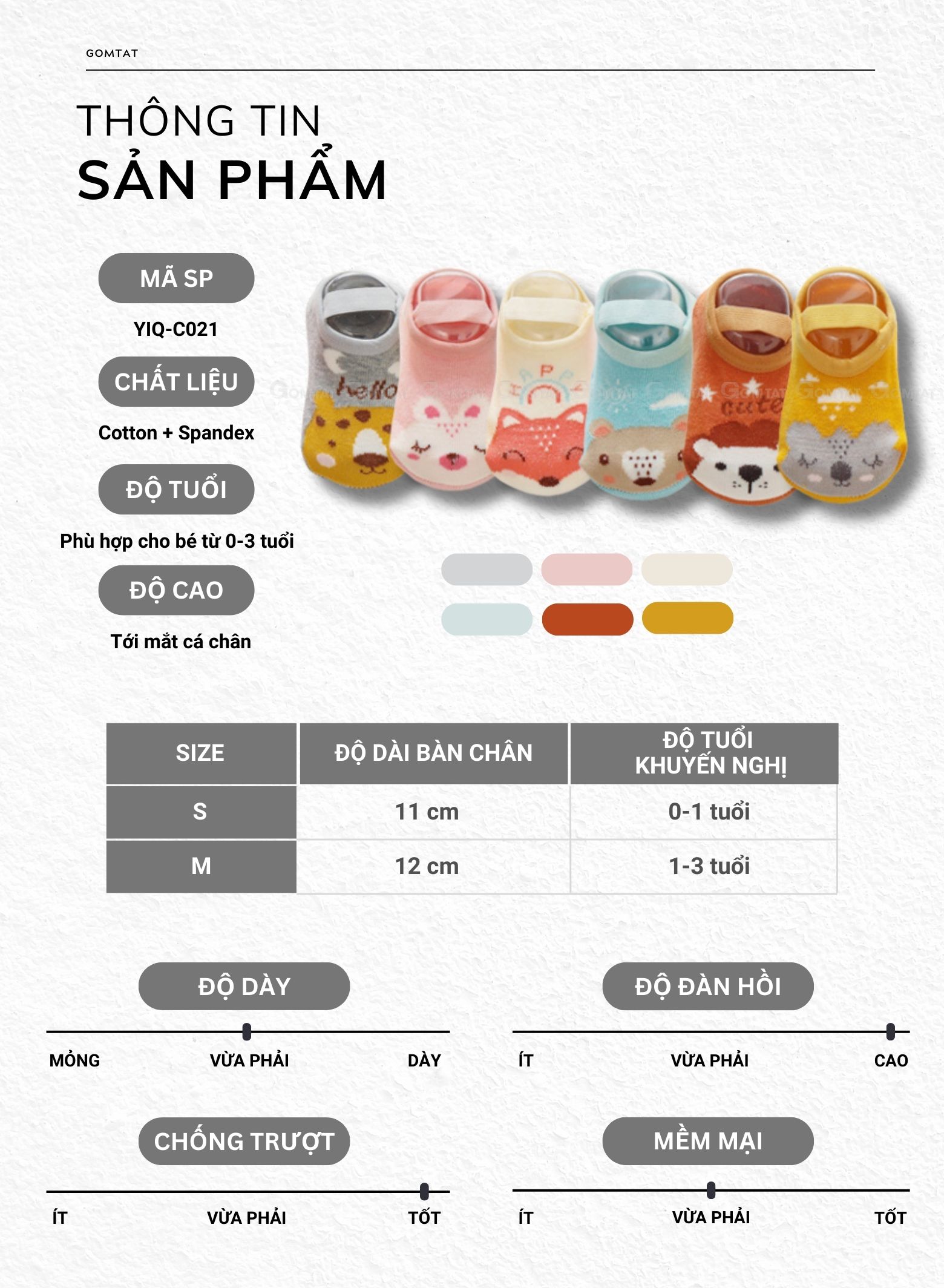 CHI TIẾT SẢN PHẨM - Chất liệu: Sợi Cotton, Sợi Spandex - Mã SP: YIQ-C021-CB6 - Quy cách đóng gói: 6 đôi đủ màu - Size: S (0-1 tuổi), M (1-3 tuổi) - Màu sắc: Trắng, Xám, Đỏ, Hồng, Xanh, Vàng