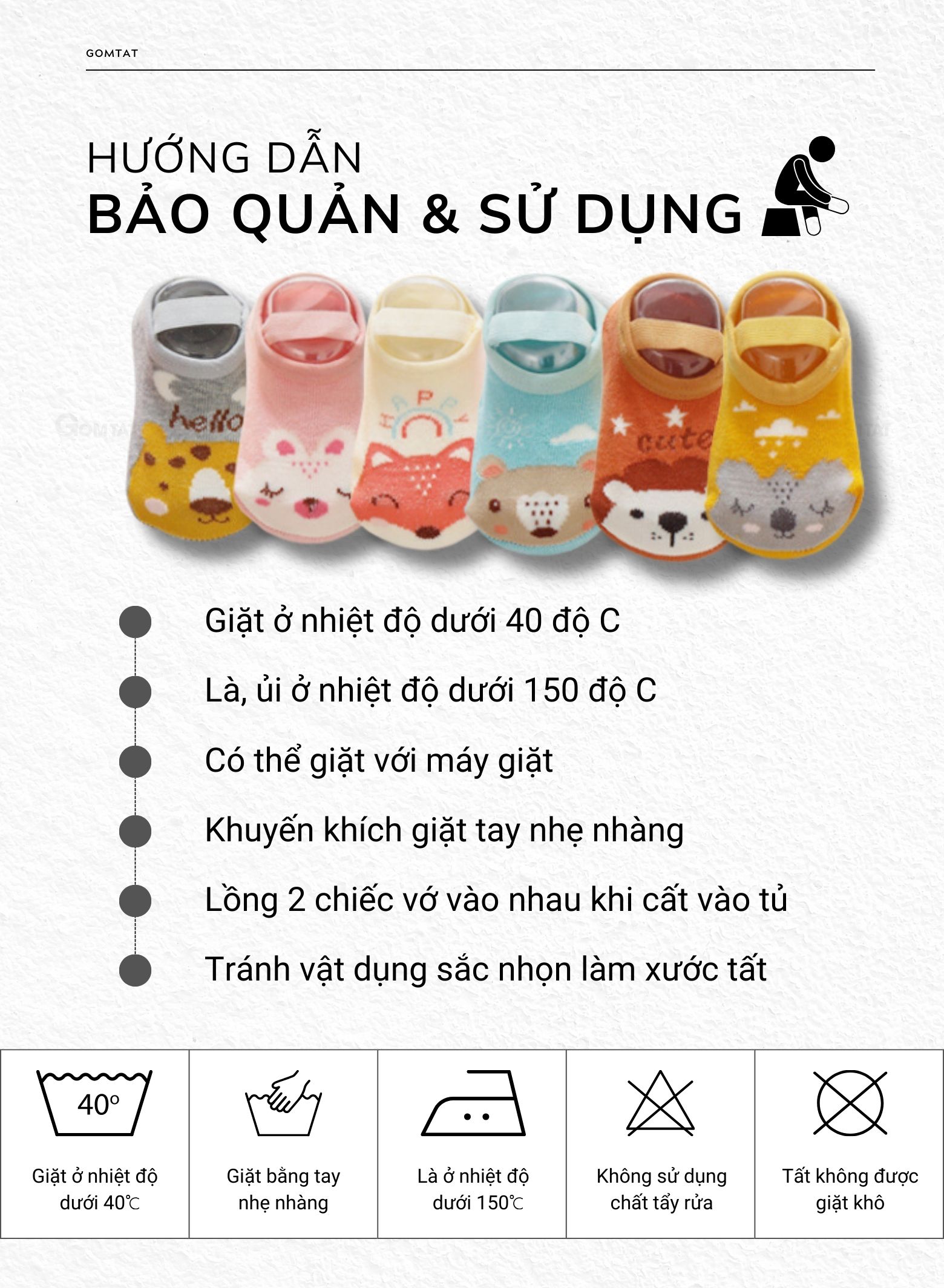 BẢO QUẢN TẤT NHƯ THẾ NÀO? 1. Lộn Tất từ bên trong ra ngoài trước khi giặt. 2. Sắp xếp Tất và giặt theo cặp để tránh bị mất. 3. Giặt bằng máy (đối với hầu hết các loại Tất) và bỏ vào túi giặt. 4. Giặt bằng nước không quá 30 độ C. 5. Không sử dụng thuốc tẩy. 6. Không là/ủi Tất. 7. Sấy khô Tất ở nhiệt độ thấp (chấp nhận được) hoặc để khô tự nhiên.