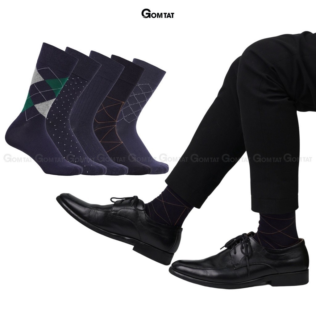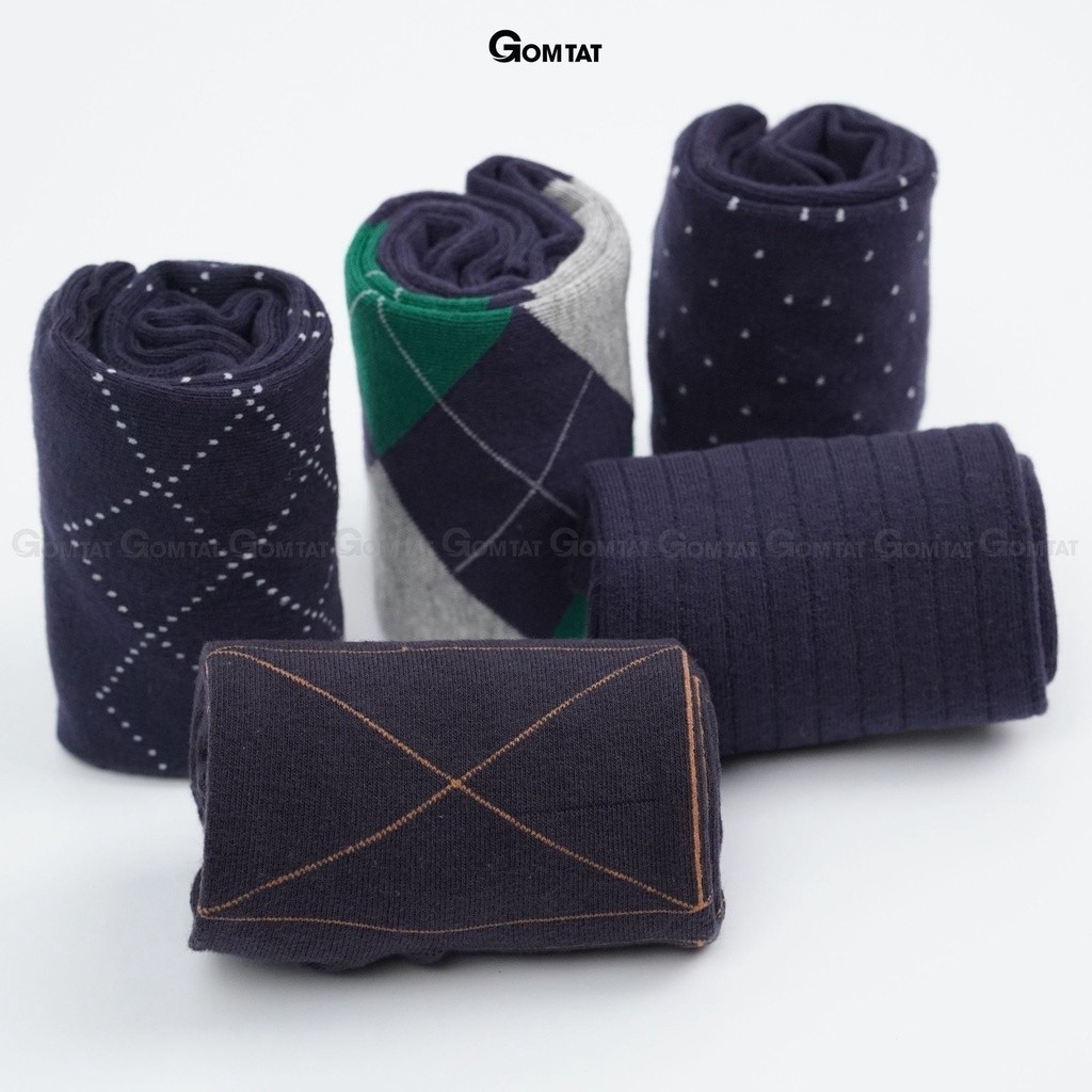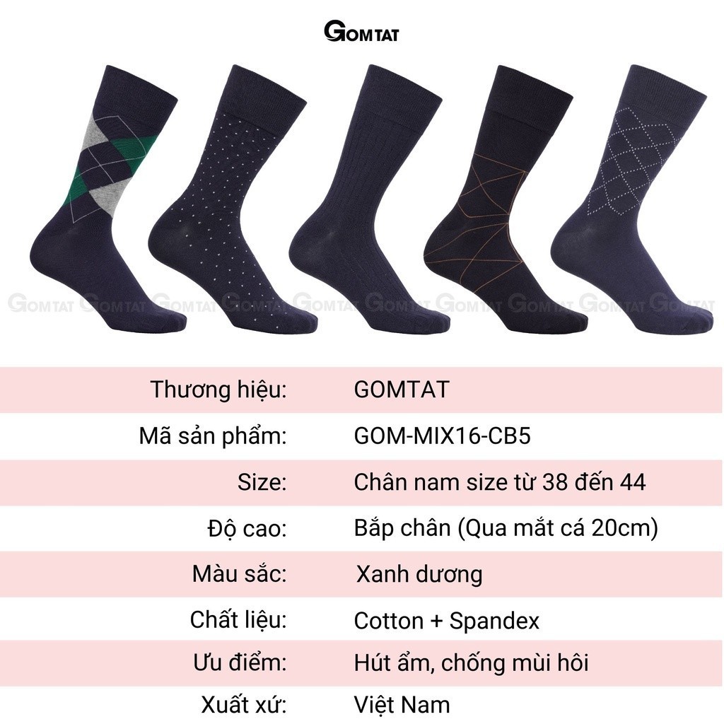 Hộp 5 đôi tất giày tây nam công sở GOMTAT mẫu MIX16, chất liệu cotton mềm mại, hút ẩm thoáng khí - GOM-MIX16-CB5: Là loại vớ cổ Cao với tone màu xanh dương cá tính, phù hợp cho KH cá tính mạnh phối với giày thể thao, hoặc giày tây công sở, chất liệu cotton khử mùi thoáng khí, êm ái khi sử dụng.